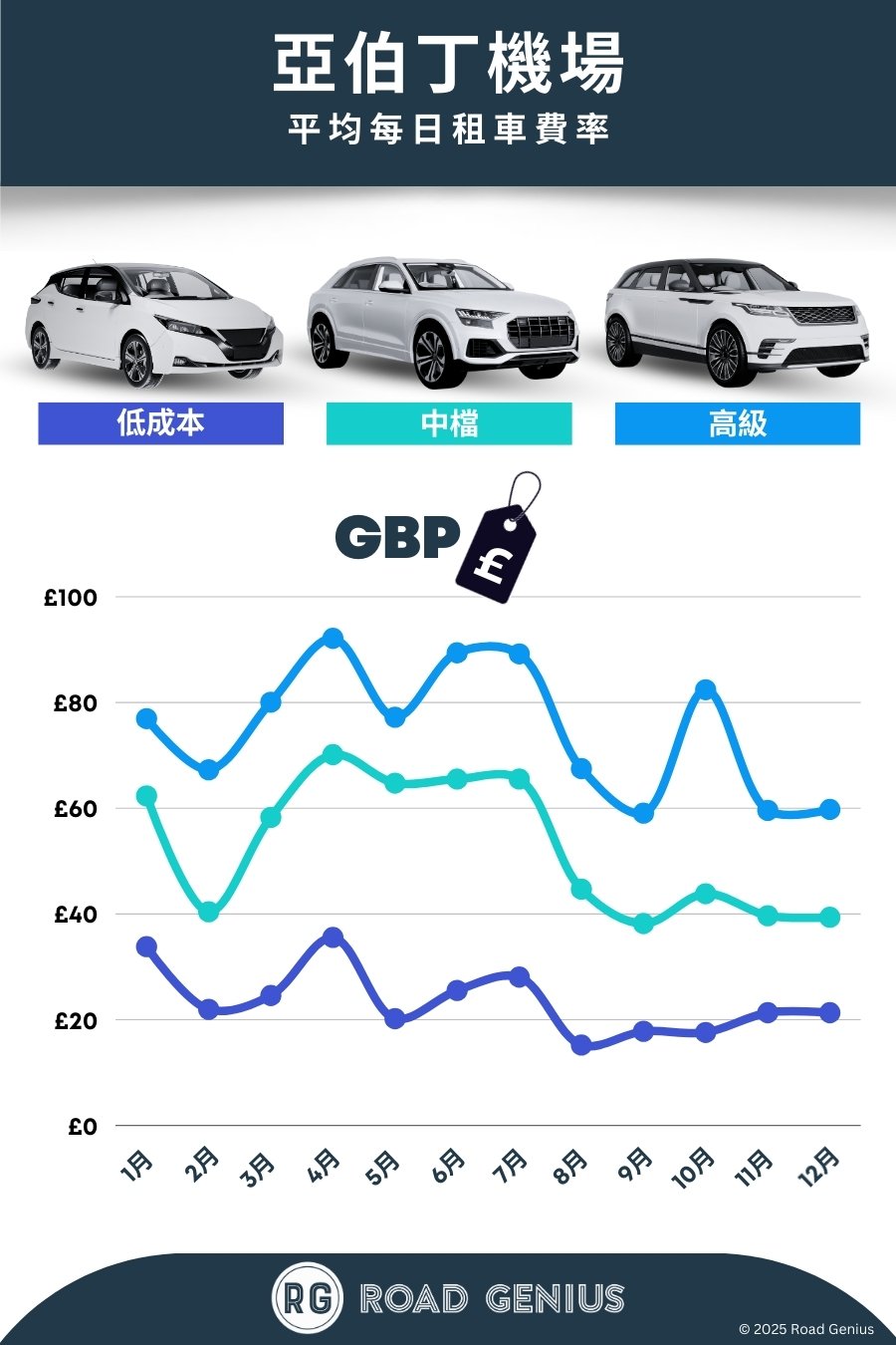 平均而言,阿伯丁機場 的租車費用約為每日 €50,最低價格為每日 €15