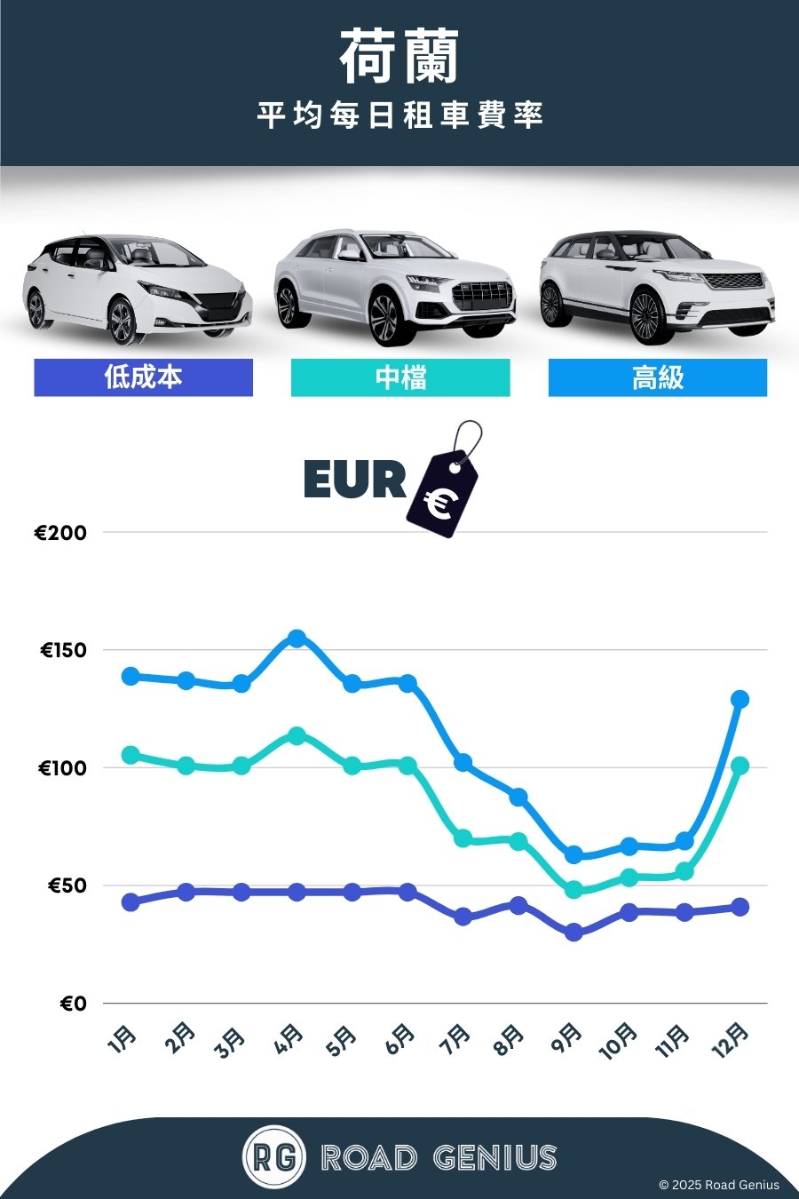 平均而言,荷蘭 的租車費用約為每日 €80,最低價格為每日 €30