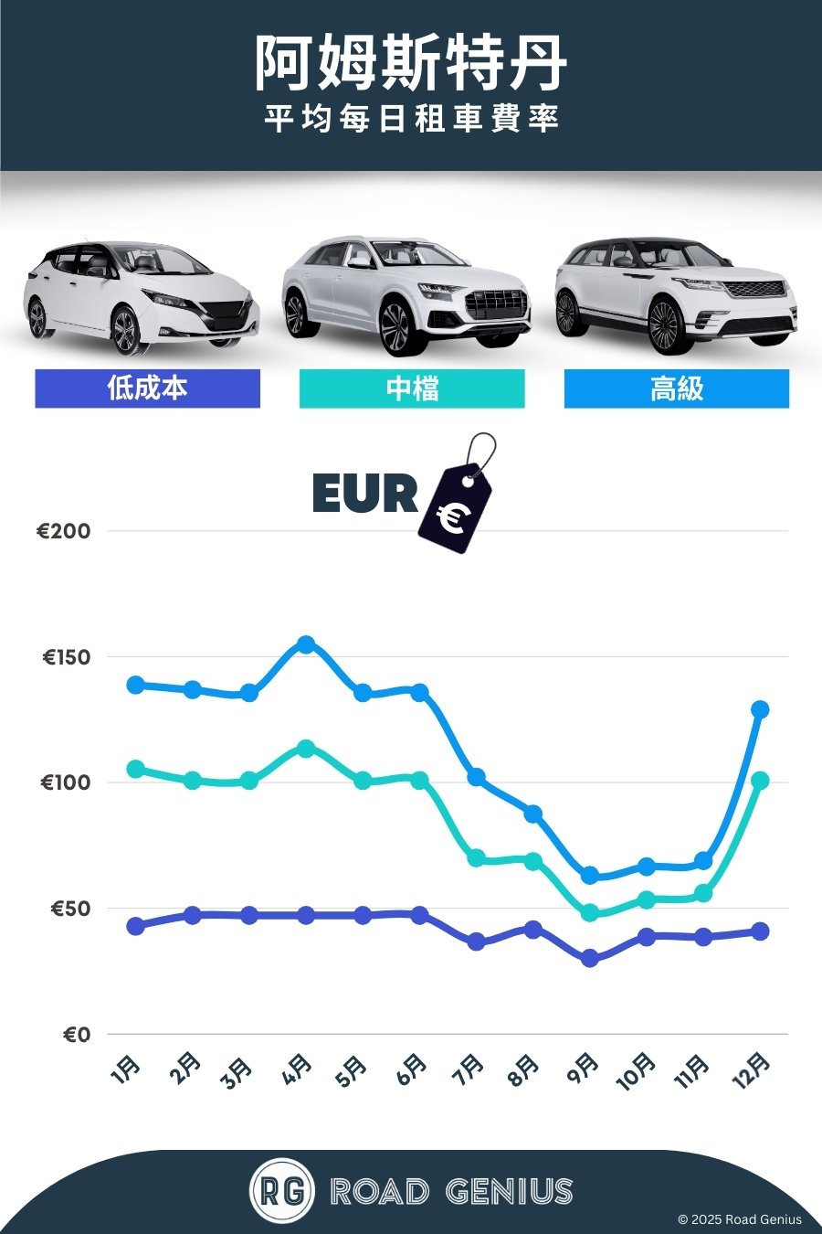平均而言,阿姆斯特丹 的租車費用約為每日 €80,最低價格為每日 €30。