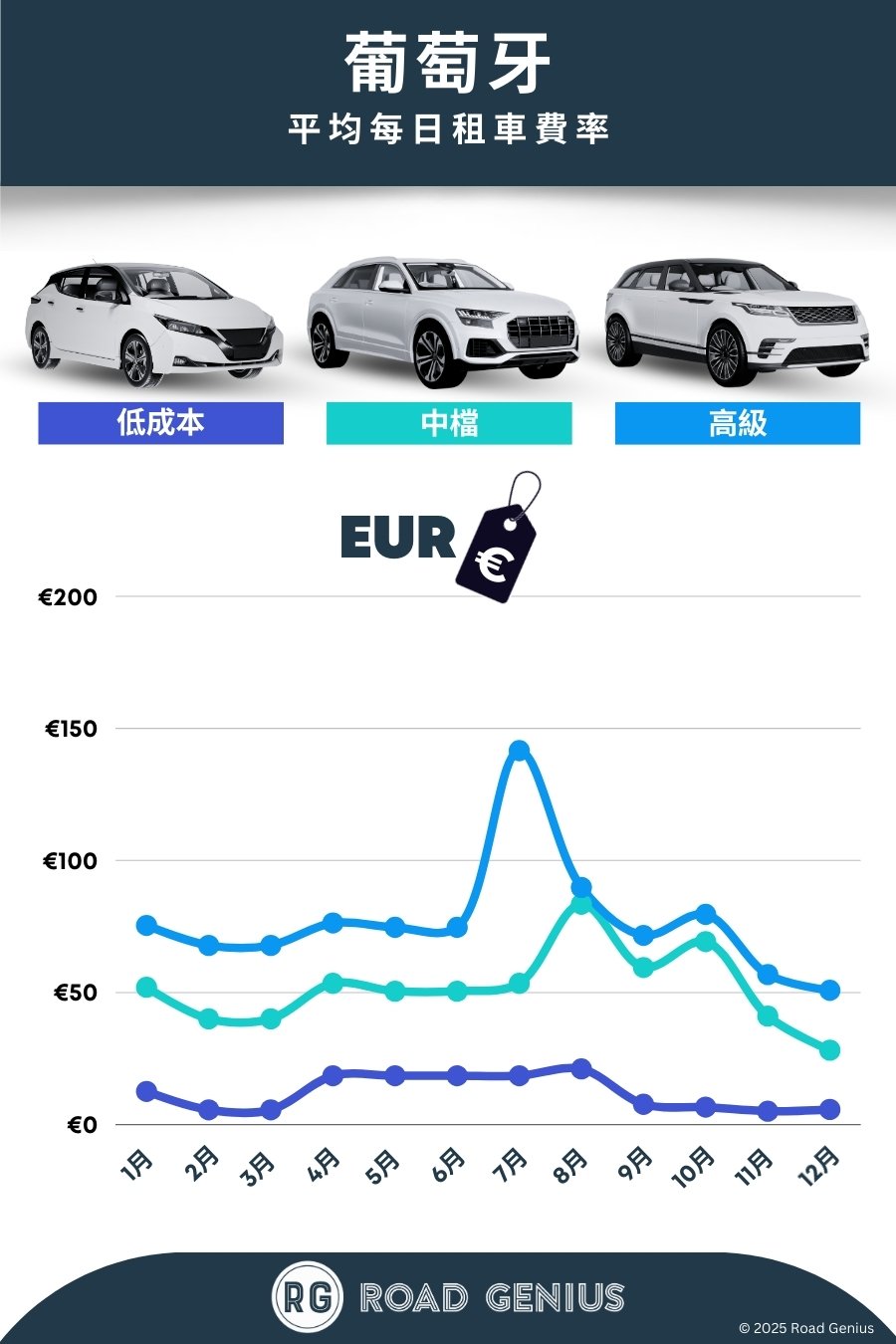 平均而言,葡萄牙 的租車費用約為每日 €47,最低價格為每日 €5。