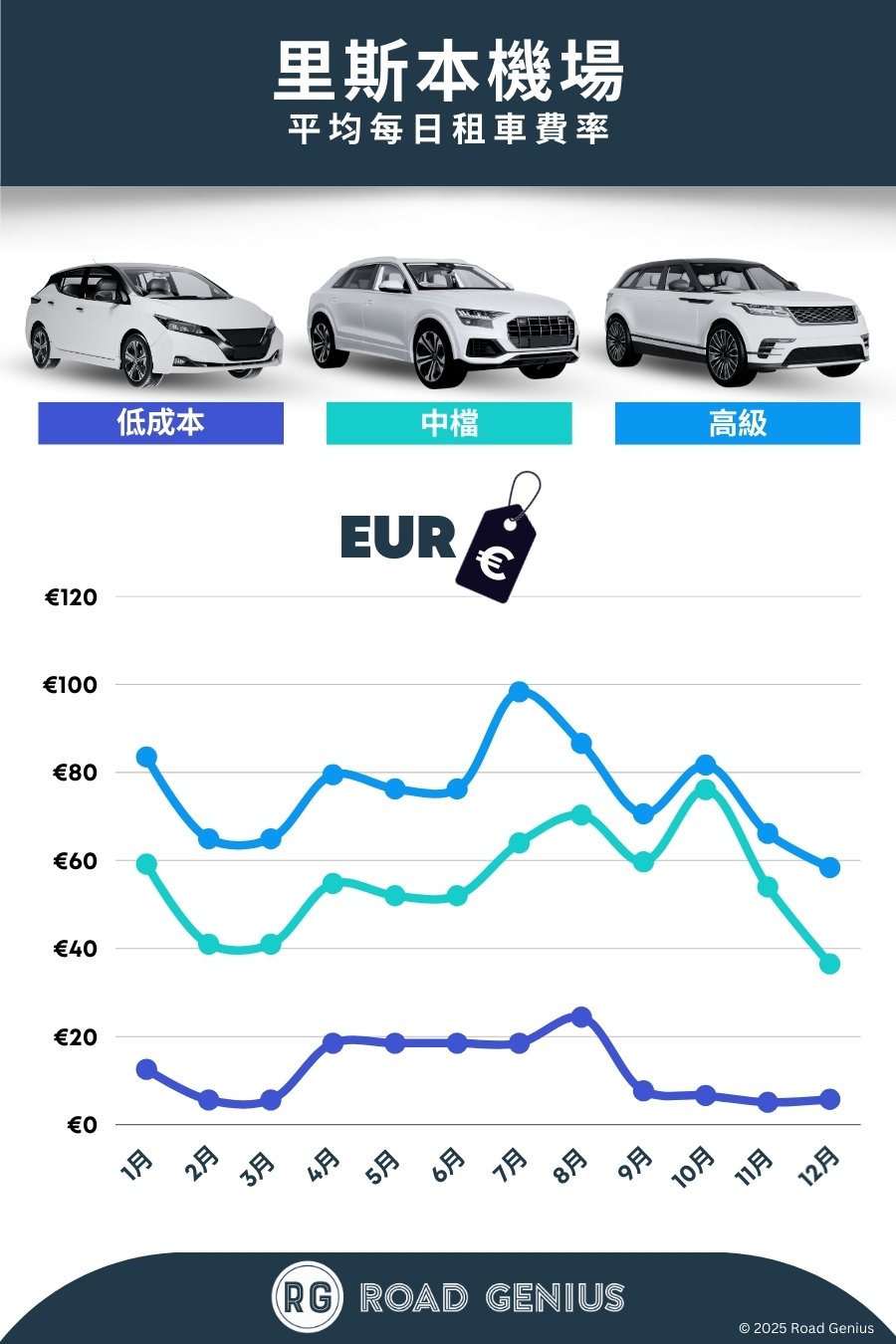 平均而言,里斯本機場 的租車費用約為每日 €48,最低價格為每日 €5。