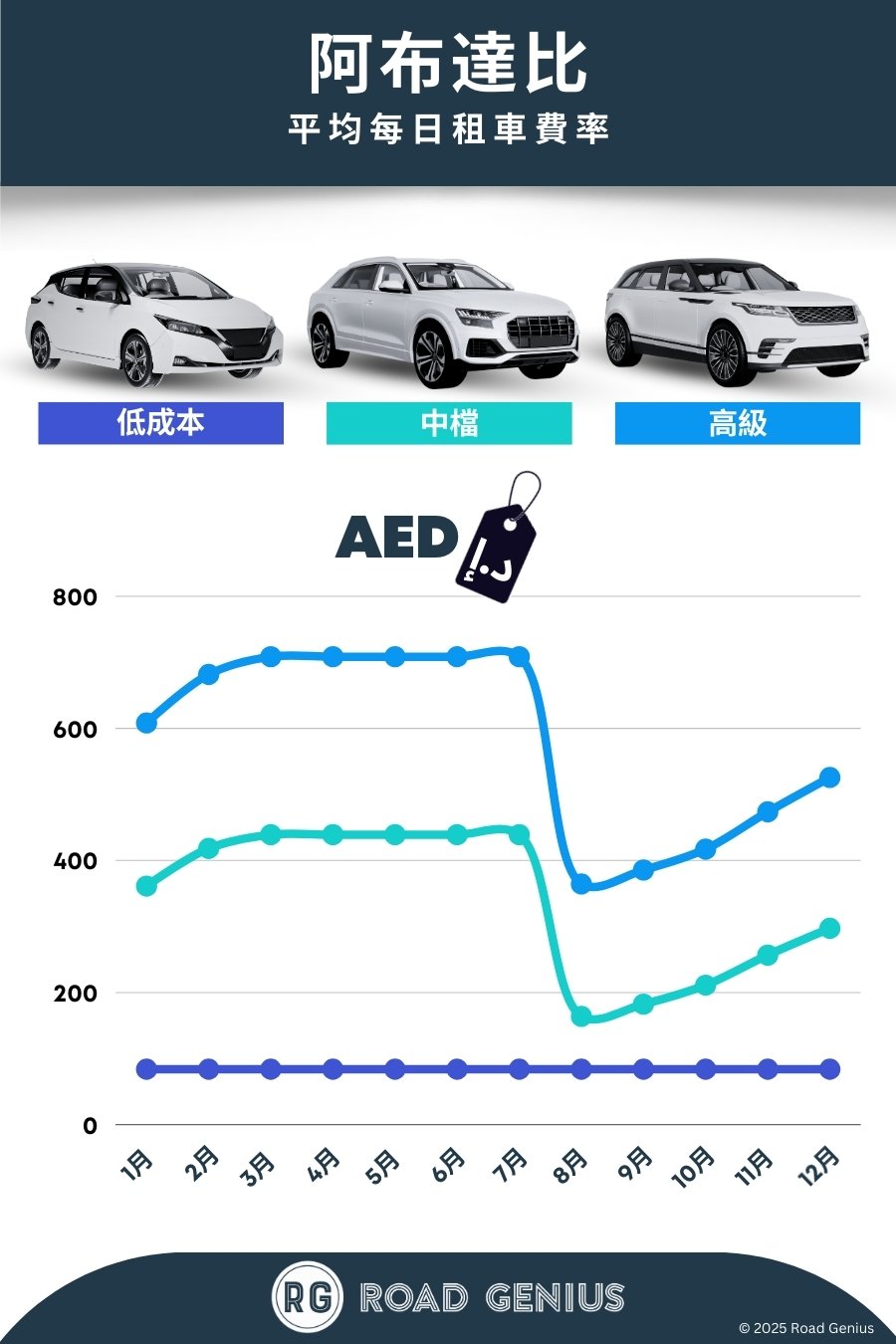 平均而言,阿布扎比 的租車費用約為每日 362 AED,最低價格為每日 39 AED