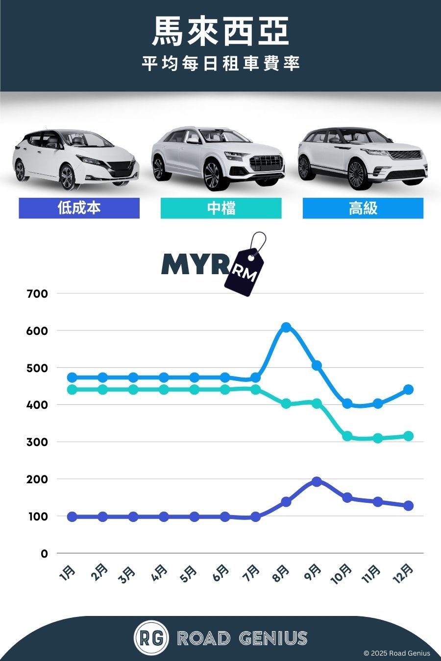 平均而言,馬來西亞 的租車費用約為每日 331 MYR,最低價格為每日 98 MYR